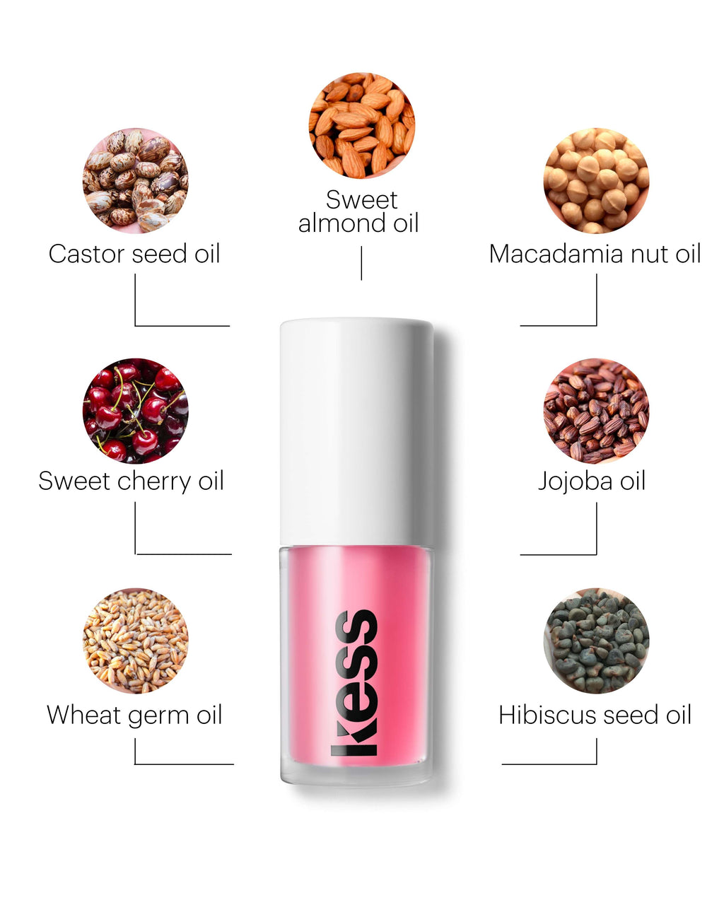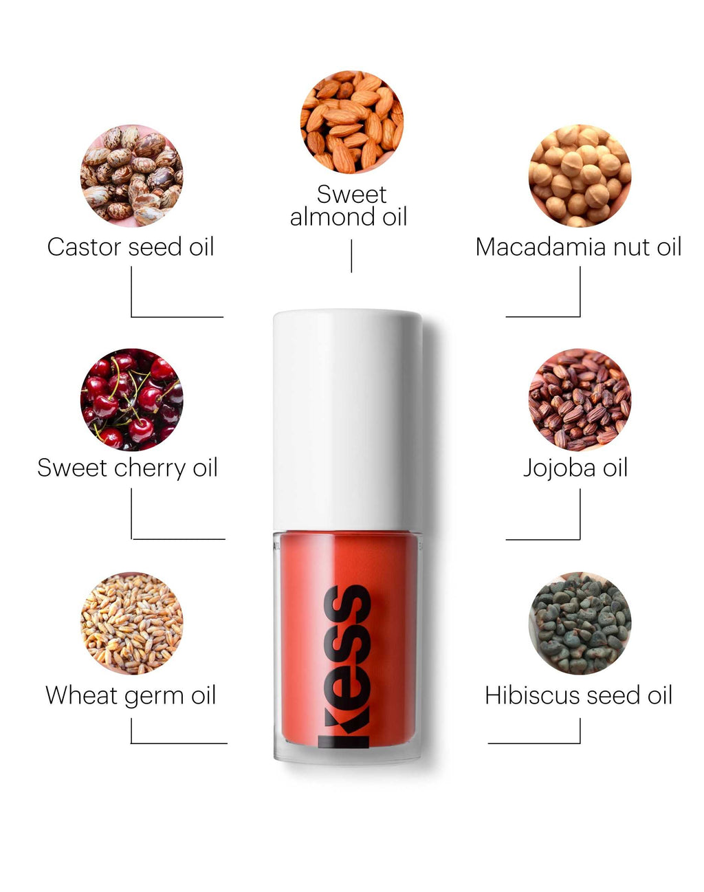 - Tinted lip oil in 5 shades with a delicate vanilla fragrance